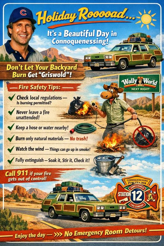 | ☀️🚗 The weather’s looking great today — perfect for getting outside. But before you go full Clark Griswold in the backyard, let’s make sure your “vacation plans” don’t turn into a call to Station 12. 🔥 Planning to burn today? Don’t let it turn into a Griswold disaster: 🔥 Never leave your fire unattended (even for a “quick trip”) 🚒 We’d rather you enjoy the sunshine than meet us unexpectedly. If your fire gets out of control, call 911 immediately. Stay safe, and enjoy the day — no detours to the emergency room or the fire station needed! |