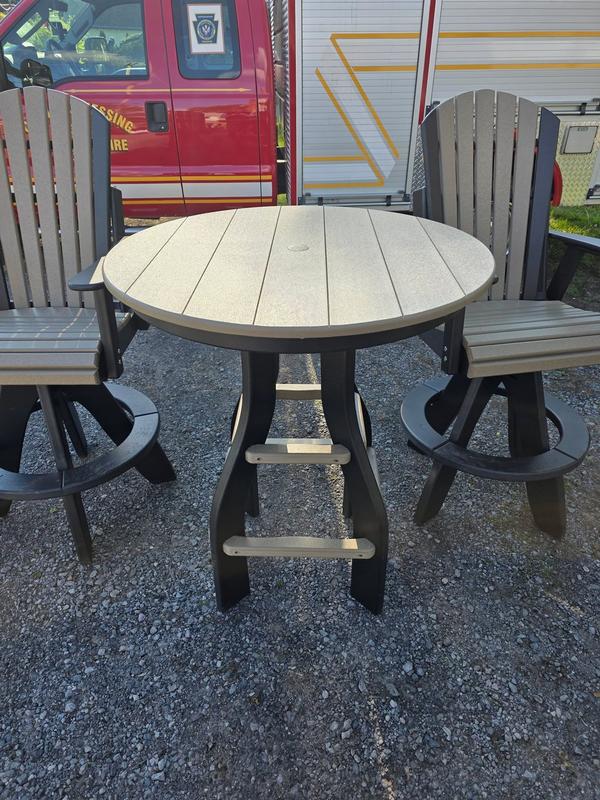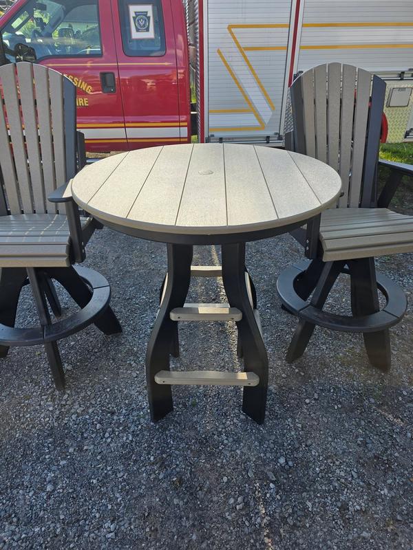 Package Includes: • 36” Round Bar Height Table w/ hole and plug (Black / Weatherwood) • (2) Fanback Bar Height Swivel Chairs